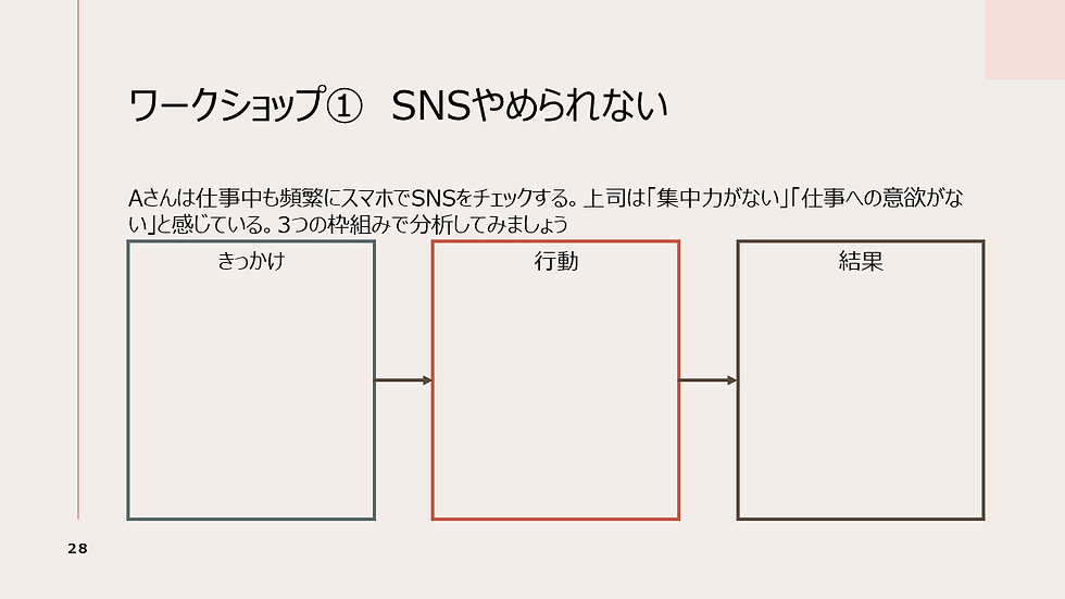 講師からは、「③は強化(または期限を守る行動の弱化)」という整理と、